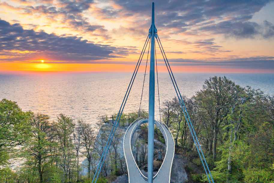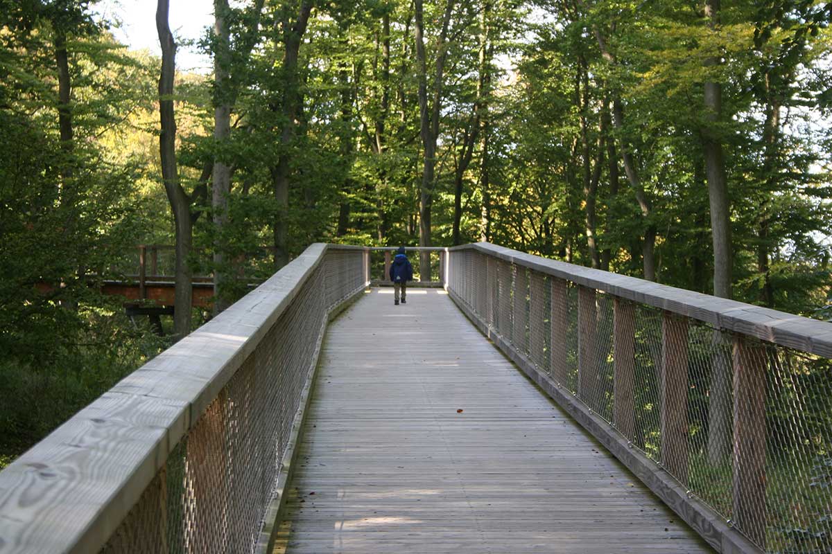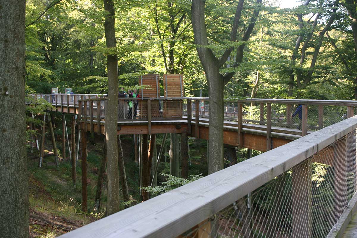 The treetop path is 1250 m long. With 82 m above NN, the observation tower in the form of an eagle's nest stands tall above the the treetops. This enables one to have a marvellous panorama view over the island of Rügen.